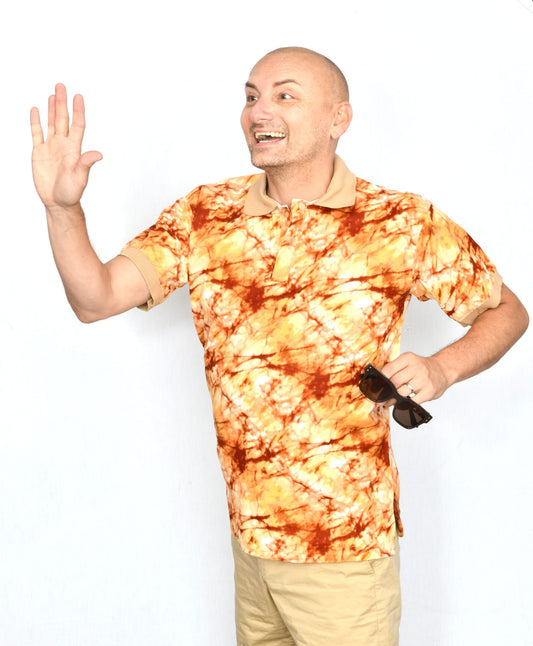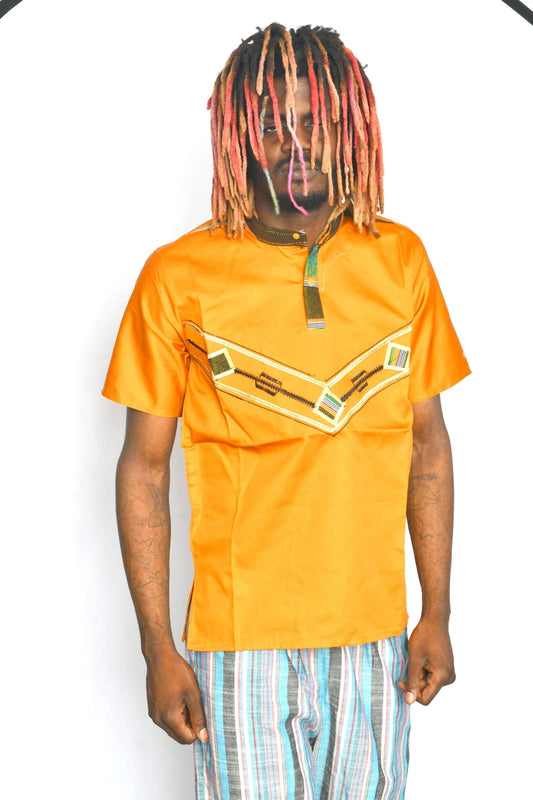 Akwaba Men's Shirts Short Sleeve Rust Orange Yellow w/ Tan collar