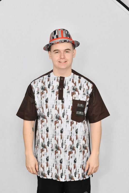 Akwaba Men's Shirts Short Sleeve Brown w/ Brown & Black Splatter on White background